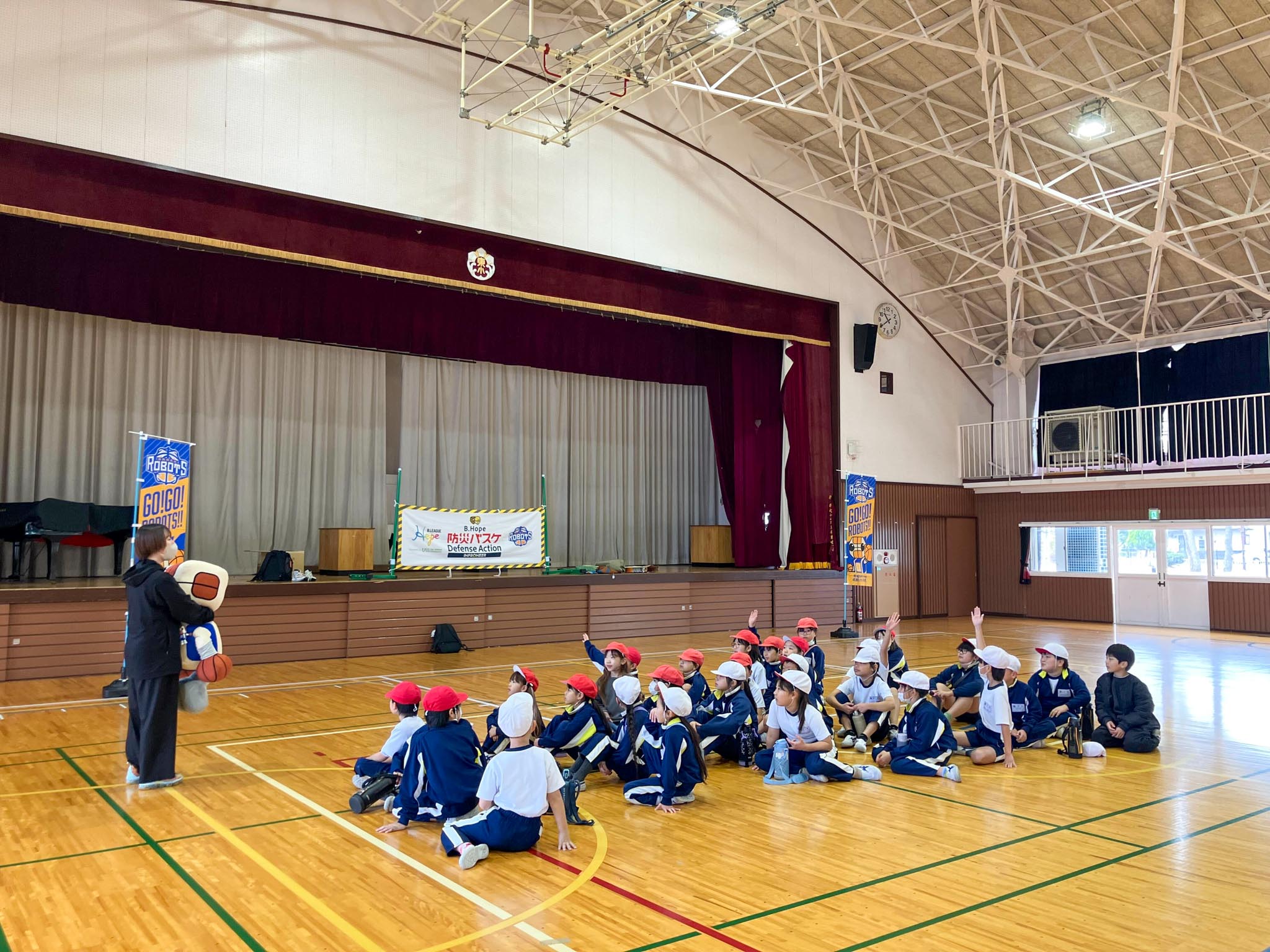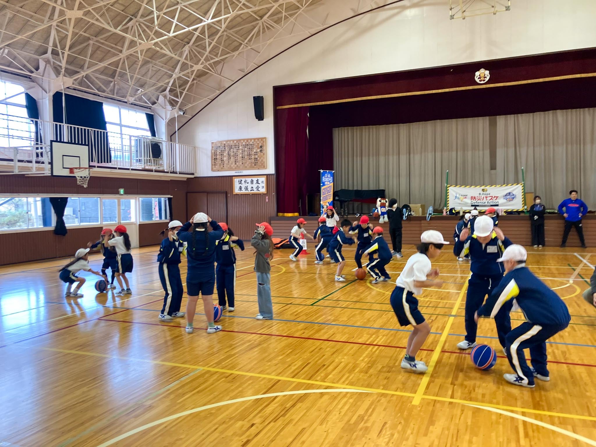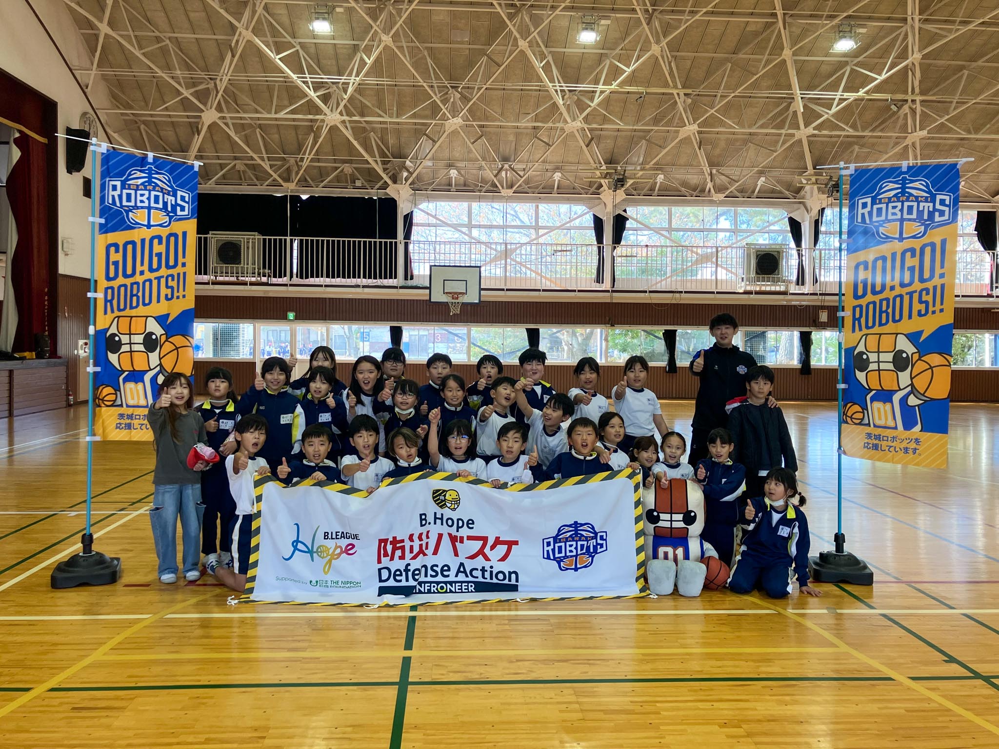 この度、茨城ロボッツでは「B.Hope 防災バスケ」の一環として、バスケのアクションを通して防災の知識を学ぶ授業を行いました。