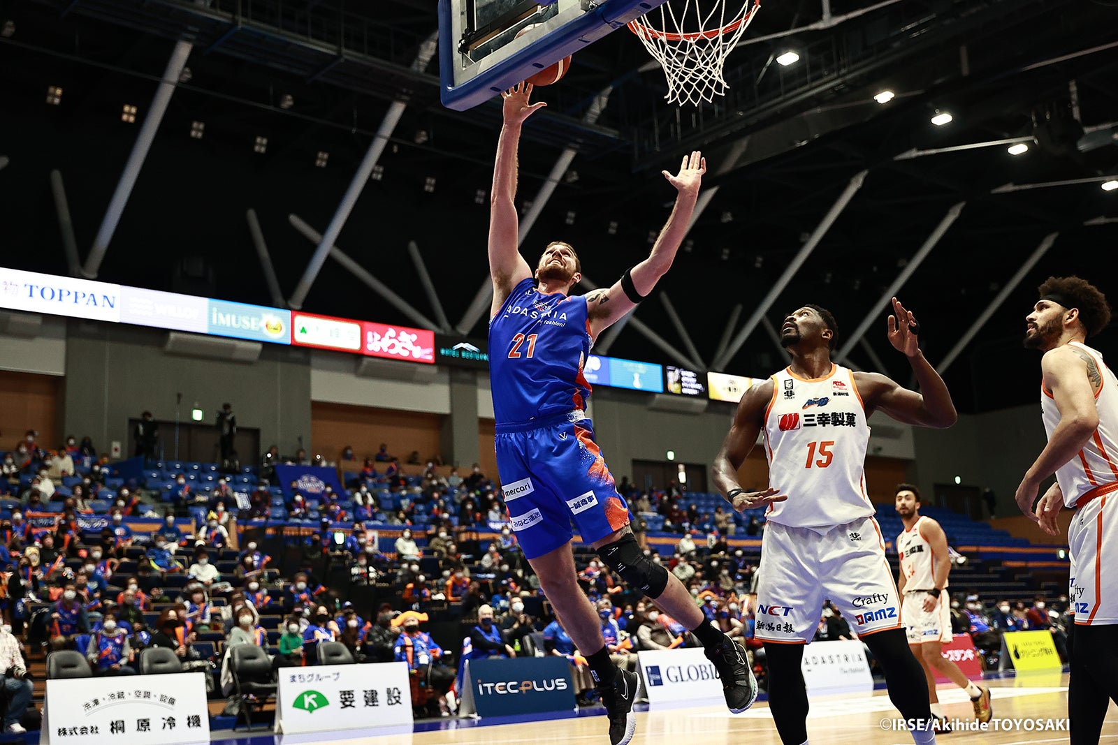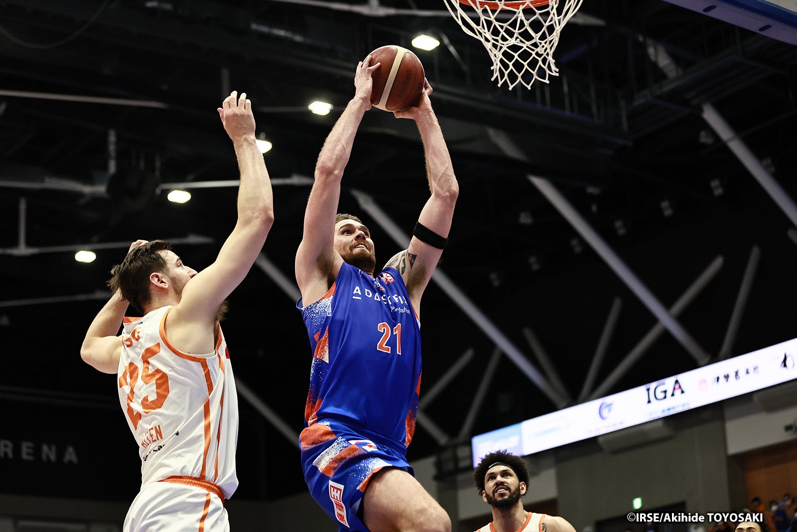 新潟に立て続けにシュートを決められ逆転を許す。#21 ジェイコブセンがリバウンドをタップで決めバスケットカウントに。フリースローを沈め同点に追いつく。流れが続かず得点が止まるも、#21 ジェイコブセンがリバウンドをまたしても押し込みインサイドで強さを見せる。中盤、新潟#6 パラス選手にバスケットカウントを決められ8点ビハインドとなりタイムアウト。タイムアウト後、#8 多嶋がドライブインからフローターを決め、点差を縮める。さらに、#21 ジェイコブセンのダンク、#11 タプスコットのアリウープなど勢いが出始め詰め寄る。#29 鶴巻、#11 タプスコットも積極的にペイントアタックをしてフリースローを獲得するが、新潟に3Pシュート、ドライブインで得点を許し29-38で前半終了。