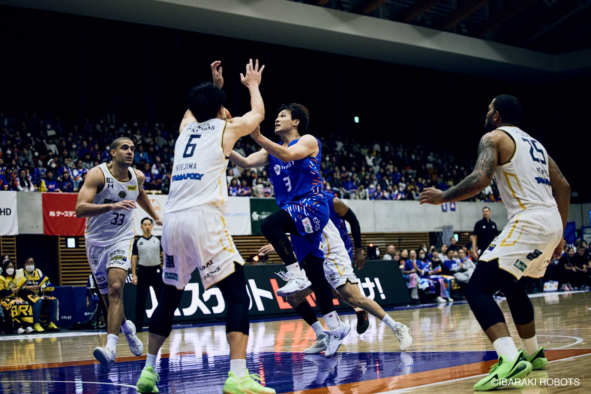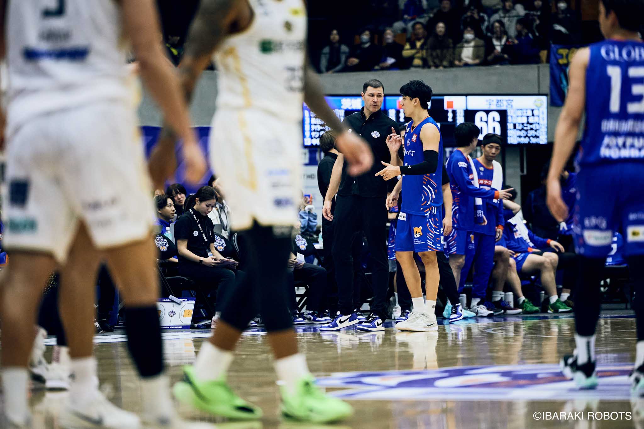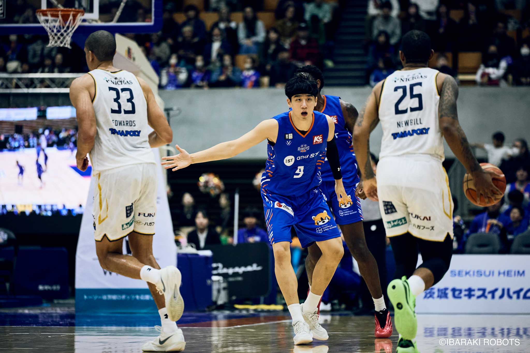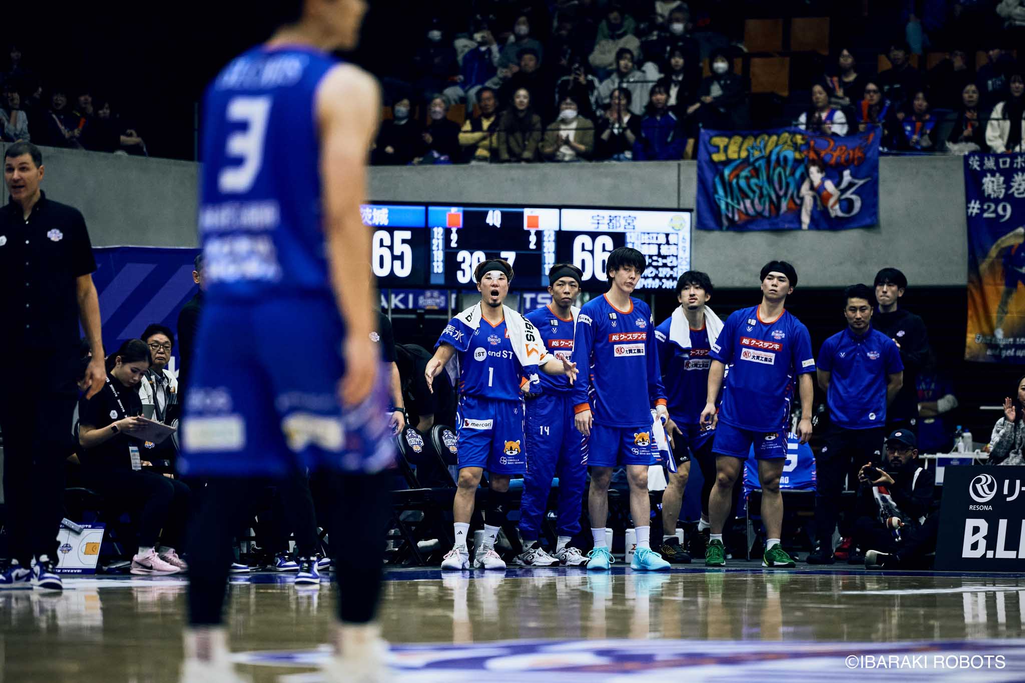 #8 クックがダンク、ファストブレイクで得点を重ねる。#3 長谷川はディフェンスで連続スティールを見せ、#0 フランクスのバスケットカウントに繋げる。#10 陳岡が攻守に渡りハッスルし、ロボッツペースに。終盤でも#8 クックが果敢にインサイドへ攻め込み、連続でバスケットカウントを決める。33-43で前半終了。